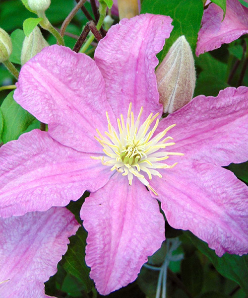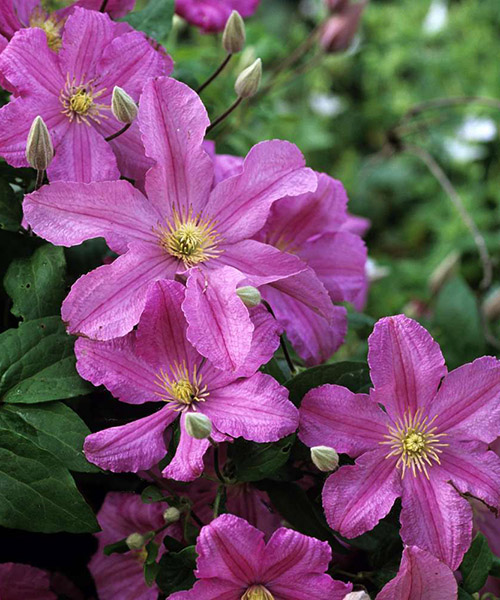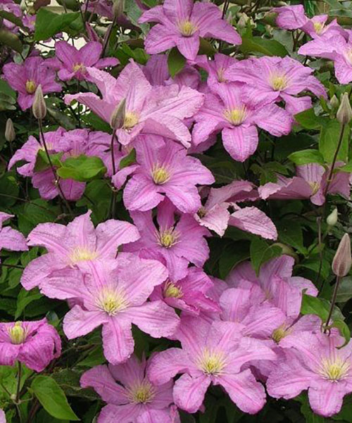 Клематис Comtesse de Bouchaud (Комтесс де Бушо) - один з найніжніших великоквіткових сортів французької селекції. Квітки цього сорту мають 6 пелюсток з нерівною, щербатою поверхнею і світло-жовтими тичинки. Кінчики пелюсток, як правило, загинаються вниз, що надає квітці округлий вигляд - тому цей сорт легко відрізнити. Як і у багатьох клематисів, квіти розташовані трійками, більшість у верхній частині рослини. Починають цвісти наприкінці червня і цвітуть досить довго. Цей клематис цвіте на пагонах першого року, тому і обрізка дуже проста - після зими відріжте всі стебла клематиса, залишаючи 1-2 пари бруньок від землі. Діаметр квітки - 16 см. Це ідеальний клематис для початківців - невибагливий, стійкий до холоду і хвороб. Зазвичай досягає лише 2 метрів у висоту, прекрасно підходить для невеликого саду, можна вирощувати пропускаючи між невеликими хвойними або чагарниками, можна вирощувати в горщиках. Легко вирощувати на родючому, удобреному, вологому (але не мокрому) ґрунті. Хоча переважна більшість клематисів обожнюють сонце, цей сорт підходить для вирощування в півтіні, що дозволяє зберегти рожеві квітки від вицвітання.