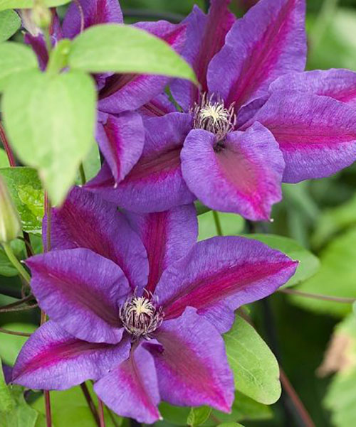 Клематис Mrs N. Thompson (Миссис Томпсон) – ранний очень красивый неприхотливый английский сорт. Образует крупные, простые цветки, диаметром – до 17 см. Окраска яркая, двухцветная. Основной тон фиолетовый, посередине чашелистика проходит малиновая полоса. Чашелистики имеют эллипсоидную форму, на концах заостренную. Тычинки красного цвета. Зацветает кустарник на перезимовавших побегах прошлого года. Цветение обильное, продолжительное, в начале и конце лета. Группа обрезки клематиса Миссис Томпсон – 2-ая, слабая. Побеги текущего года сохраняют и укрывают на зиму. На них будет происходить основное цветение в следующем году. Обрезают кустарник несколько раз. Сначала в середине лета срезают отцветшие побеги текущего года, удаляя их до основания. Затем в период подготовки к зиме укорачивают побеги, появившиеся в новом сезоне. Оставляют длину 1-1,5 м. Такая частичная обрезка позволяет получать пышное цветение в течение всего теплого сезона. Место для выращивания клематиса Миссис Томпсон должно быть солнечное. Необходимо продумать направление посадки учитывая, что цветки будут всегда поворачиваться по направлению к солнцу. Участок для посадки выбирают на возвышенности без близкого залегания грунтовых вод. В месте выращивания лианы необходимо защищать от резких порывов ветра.