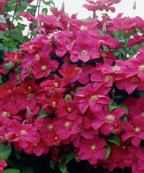 Клематис Rouge Cardinal (Руж Кардинал) - дуже гарний, ранній сорт французької селекції. Дуже красива і рясно квітуча ліана. Цвіте з липня по жовтень на пагонах поточного року. Квітки поодинокі, розкриті, досить великі 10- 15 см в діаметрі. Чашолистків 6, вони широкі і заходять один за одного. При розпусканні чашолистики фіолетово-червоні, пізніше стають кармінними або пурпурно-червоними. Середня смуга на них трохи світліше. Пильовики блідо-пурпурні до білих. Чагарникова ліана, довжина пагонів якої досягає 200 -250 см. На одному кущі зазвичай близько 5 - 10 пагонів. На одному пагоні розвивається 10 - 15 квіток. Листя у клематиса невеликі, трійчастого, темно-зеленого кольору. Рослина досить стійка до умов зростання. Може рости в півтіні. Рослини слід вкривати на зиму. Підходить для вирощування у пергол, арок, трельяжів і інших садових опор. Прекрасно прикрашає альтанки, тераси, балкони або стіни будинків. Тип обрізки - 3 (сильна). Рослину обрізають на висоті до 50 см.