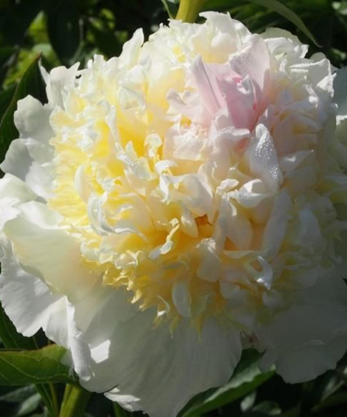 Півонія Top Brass - дивовижний сорт триколірного забарвлення. Білі чашовидні квіти прикрашені високим ніжно-рожевим чубчиком і яскравою жовтою серцевиною. На тлі різьбленого, насиченого, зеленого листя бутони півонії Top Brass грають своїми чудовими барвами і створюють неповторний оазис краси на вашій клумбі. Висота рослини 70-80 см, при повному розкритті діаметр квітів досягає 14 см. Квіти мають приємний солодкуватий аромат. Чудово підходить для оформлення клумб і бордюрної посадки. Висаджувати півонії можна з початку квітня до кінця травня, а також восени з кінця вересня і до листопада. Для цього викопують ями глибиною і шириною 50-60 см на відстані 90-100 см один від одного. При посадці в яму необхідно додати компост, перегній і деревну золу. Після посадки добре полити. Глибина посадки повинна бути 4-5 см над бруньками відновлення.