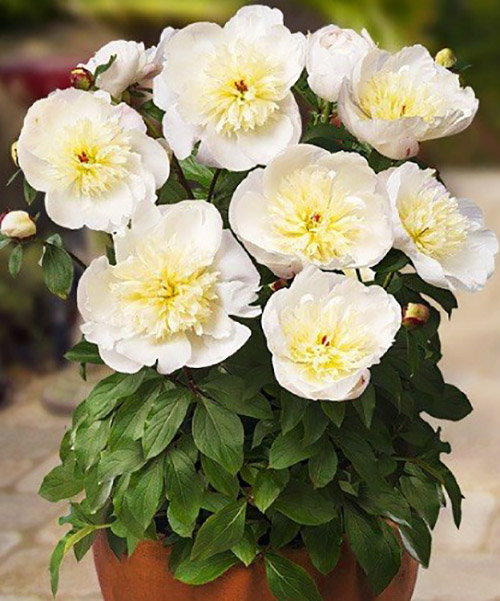 Півонія Madrid - низькорослий сорт, ранньоквітучий. Квіти напівмахрові, нижні пелюстки білі, а серединка ніжно-лимонного кольору. Вони виглядають дуже ніжно і безневинно. Квіти мають приємний аромат. Чагарник зберігає свою декоративність ще до цвітіння, а після, восени, багряні пагони також прикрашатимуть Ваш сад. Висота рослини до 40 см, бутони невеликі близько 6-10 см в діаметрі. Завдяки компактному розміру, даний сорт можна вирощувати і в горщиках.