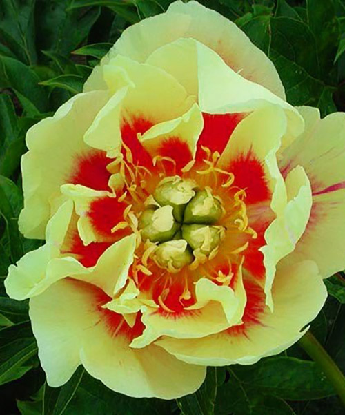 Півонія Border Charm має напівмахрові квіти 13-15 см в діаметрі. Пелюстки лимонного кольору з червоно-бордовою серединкою. Аромат легкий. Кущ невисокий до 60 см, але в ширину розростається до 100 см. Стебла досить міцні, вони вигинаються горизонтально і формують приземистий кущ. При посадці, краще вибирати сонячне або злегка затінене місце. Відмінно виглядає в альпінарії і бордюрной посадці.