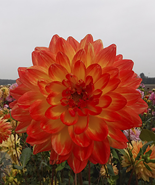 Жоржина Pasodoble Dancer - високорослий сорт з великими суцвіттями. Квітка має яскраво-помаранчеві пелюстки, які змінюються до жовтого кольору ближче до середини квітки. Такий кущ буде, як яскраве полум'я у Вашому саду. Висота жоржин досягає 120 см, діаметр квітки до 20 см. Так як рослина висока, вона відмінно буде виглядати в одиночній посадці. У квітні бульби жоржин слід підготувати до посадки. Бульби висаджують в ємність з поживною землею або торфом так, щоб вони виступали на 2-3 см над поверхнею, і тримають їх два тижні при температурі не нижче 18 °C при хорошому освітленні. Висаджувати жоржини в грунт можна тільки після того, коли прогріється земля, зазвичай це роблять в кінці травня або початку липня. Ямки під жоржини повинні бути більше грудки коренів в три рази, щоб коріння жоржини занурилося в них повністю і залишилося ще 5-7 см вільного простору. Якщо ви вибрали сорт високорослих жоржин, встановіть і закріпіть відразу опору для майбутнього стебла. Після посадки рясно полийте холодною водою, а грунт навколо них замульчуйте. Поливати жоржини потрібно 1-2 рази в тиждень, але не дозволяйте волозі застоюватися в коренях. Після перших заморозків бульби жоржин потрібно викопати, обрізати, залишивши лише п'ять-десять сантиметрів стебла. Найкраще зберігати бульби при температурі 3-5 °C при вологості повітря 60-70% в добре провітрюваному приміщенні.