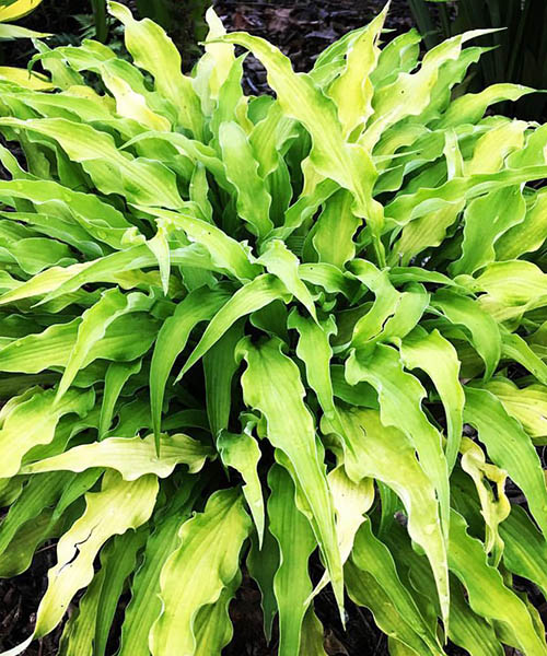 Хоста Curly Fries - низькорослий декоративний сорт. Дана хоста має незвичайне довге гофроване листя. Колір листя від золотисто-зеленого до шартрезного відтінку з восковим нальотом. Квіти білі з ліловим підтоном. Рослина невисока - всього 20-25 см. Цей сорт краще висаджувати на сонячне місце (ранкове сонце) або в півтінь, так як в тіні він втрачає гофрованість листя.