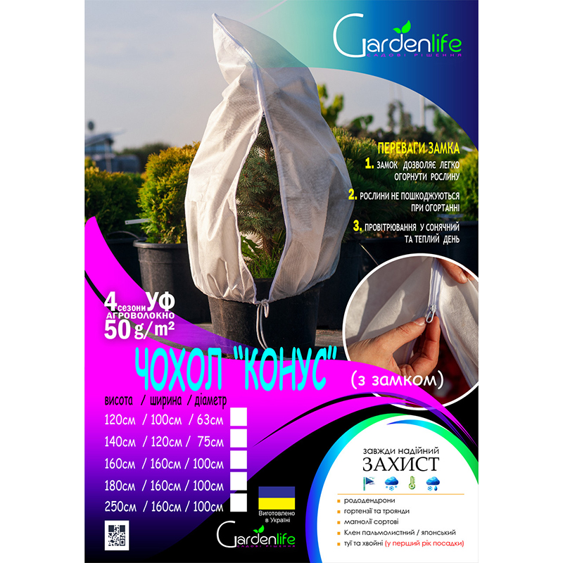 Чохол конус з замком ідеальний для захисту рослин від заморозків і дощів, а також захищає від втрати вологи, що особливо корисно під час безсніжної зими, коли немає захисного шару снігу. Замок значно спрощує процес одягання чохла на дерева і кущі, а головне рослини зовсім не травмуються. Отже, просто надіньте чохол, закрийте блискавку собачкою і зафіксуйте шнурок внизу рослини, щоб уникнути відриву чохла в разі сильного вітру.