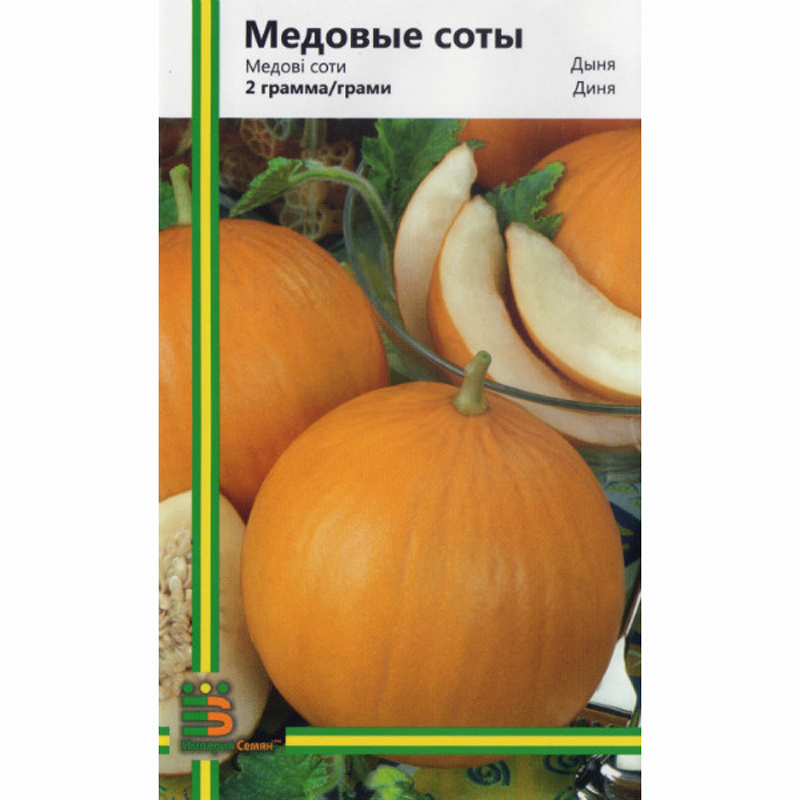 Диня Медові стільники – це середньостиглий сорт типу Жовта Канарська. Вегетаційний період від сходу до збирання врожаю становить 110-115 днів. Плід округлої форми, гладкий, кремово-жовтий, вагою 2-2,2 кг. М'якуш зеленувато-білий, ніжний, дуже солодкий і соковитий. Рекомендується використовувати у свіжому вигляді.