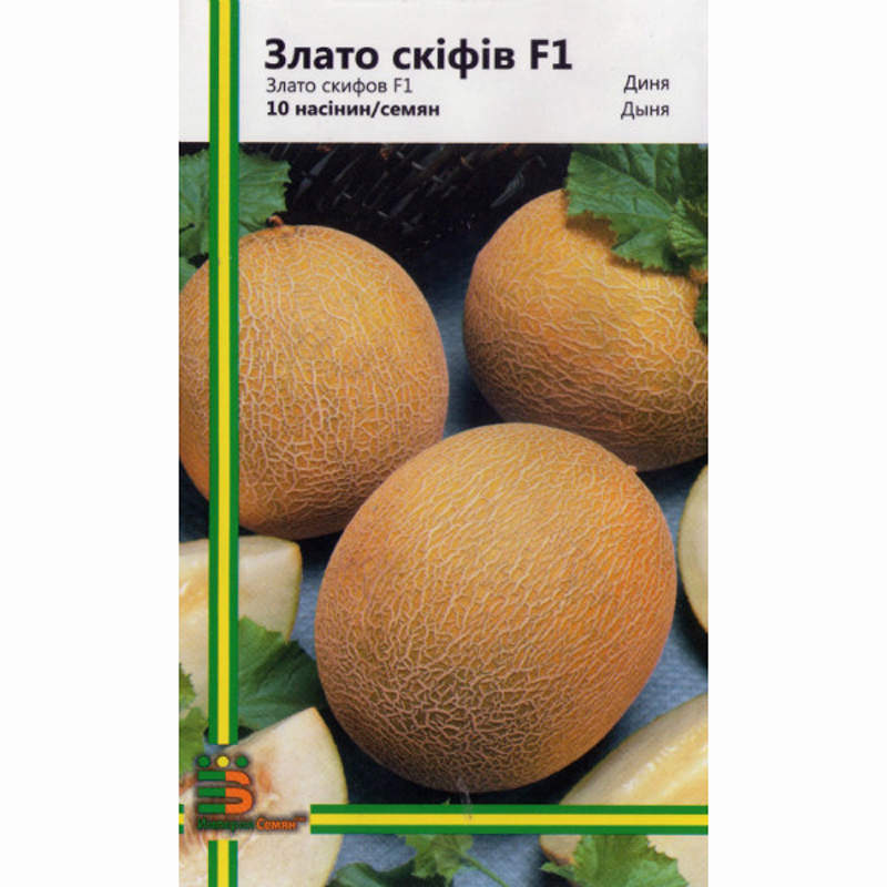 Диня Злато скіфів - це ранньостиглий гібрид, призначений для вирощування в плівкових теплицях. Вегетаційний період від сходу до збирання врожаю становить 75-80 днів. Плоди округлої форми, масою 1,1-1,3 кг, жовті, вкриті щільною сіткою. М'якуш соковитий, з дуже приємним стійким ароматом. На рослині утворюється 2-3 плоди. За смаковими якостями нічим не поступається південним диням.