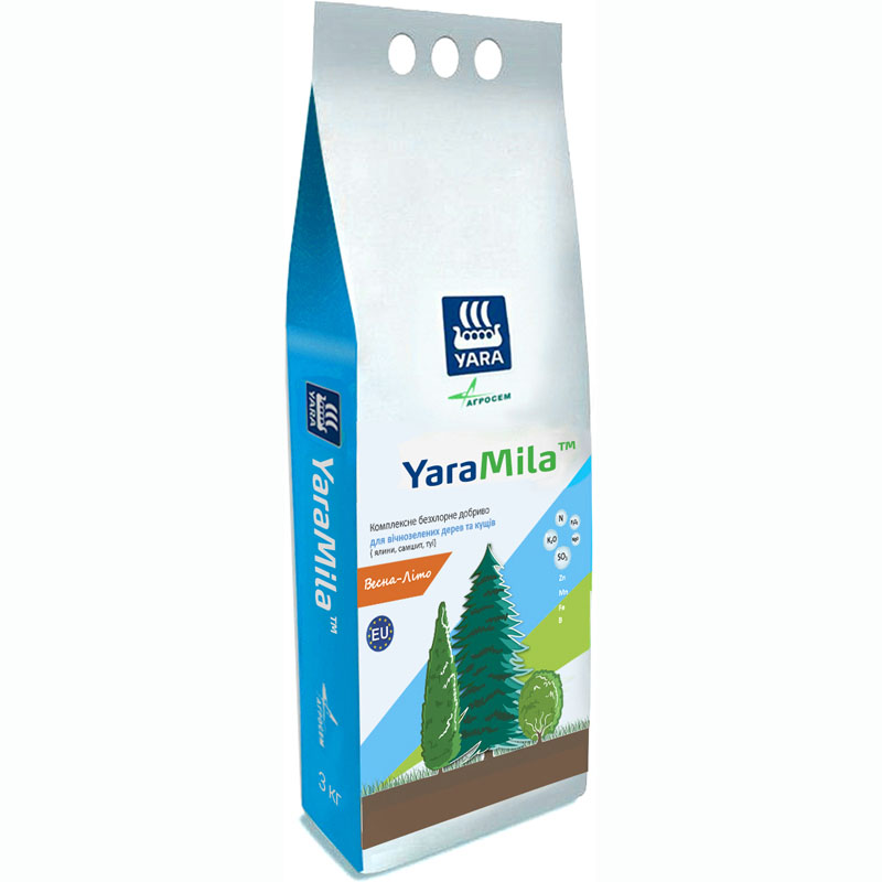 Добриво безхлорне для вічнозелених дерев та кущів Весна-Літо YaraMila - це комплексне добриво з мікроелементами, яке спеціально розроблено для ялини, самшиту, туї та інших. Добриво містить три форми фосфору, що є унікальним на ринку добрив, та дуже ефективно впливають на ріст та розвиток хвойних та декоративних рослин. Посилює їх ріст, збалансовує розвиток хвойних дерев та кущів. Внесення добрива не залежить від зрошення.