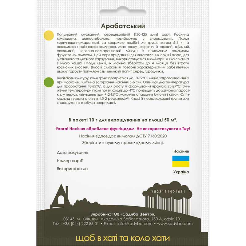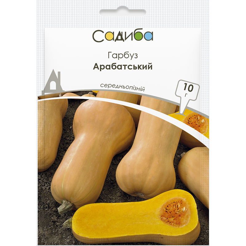 Гарбуз Арабатський - це популярний мускатний, середньопізнього терміну дозрівання (120-125 днів). Рослина компактна, довгостебельна, невибаглива у вирощуванні. Плоди коричнево-помаранчеві, грушоподібні, вагою 6-8 кг, із невеликою насіннєвою камерою. Має тонку шкірочку й товстий, щільний, соковитий, червоно-помаранчевий м'якуш із приємним солодким фруктовим смаком. Цей сорт придатний для виготовлення соків і пюре, для дієтичного та дитячого харчування, використовується в кулінарії. Плоди лежкі, їх можна зберігати до 4 місяців без втрати корисних якостей.