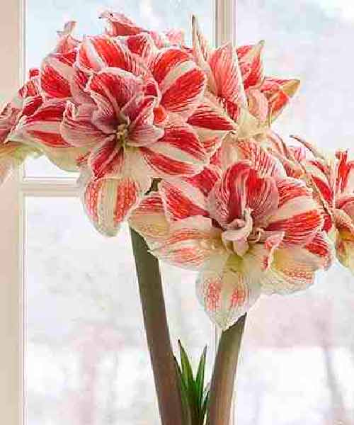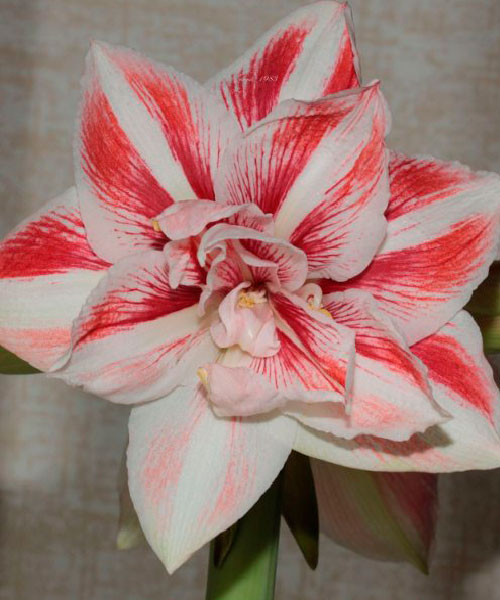 Гіппеаструм махровий Bright Nymph (Брайт Німф) - амариліс, з неповторними квітками, білі пелюстки якого густо вкриті яскравими червоними штрихами. Гідне нове доповнення знаменитої серії «Німфа». Квітки махрові, пишні, по кілька бутонів на кожній рослині. Пишні квіти - до 20 см, це більше, ніж дві складені жіночі долоні. У махровому квітці близько 15 пелюсток. Висота квітконосів до 40 см, вони міцні і добре утримують суцвіття з 2-4 величезних бутонів. До 5 тижнів ви можете милуватися екзотичним цвітінням гиппеаструма в розпал зими. Дорослі цибулини дають до 3 квітконосів. Щоб квітки розкрилися до зимових свят, робіть посадку за 80-90 днів.
