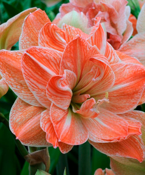 Гіппеаструм махровий Exotic Nymph (Екзотик Німф) - чудовий амариліс, нове продовження селекційної серії «Німфа». Особливо великі махрові квітки, з пелюстками ніжного рожево-цегляного кольору - відрізняються неповторним забарвленням. Зелена основа кожної пелюстки вигідно відтіняє забарвлення квітки, а білі штрихи надають йому особливу мальовничість
