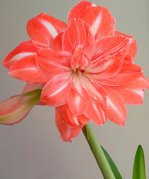 Гіппеаструм махровий Sunshine Nimph (Саншайн Німф) - гламурний, чудовий, червоно-білий амариліс, що світиться ніби червоне світло сонця, прикрасить пишним цвітінням ваш будинок в розпал зими. Цей сорт - блискуче продовження знаменитої лінійки «Німфа». Насичені оранжево-червоні квітки, витончено покриті білими штрихами - розкішні, дуже великі, з приємним слабким запахом.
