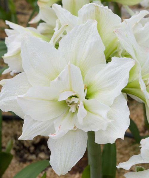 Гіппеаструм махровий White Nymph - прекрасний як казкові німфи. Ніжний білий квітка. Кінчики пелюсток і поздовжня смуга немов зворушена рожевим мазком висхідного сонця. Гіппеаструм із зеленою серединкою, яка вигідно відтіняє білизну бутона. Компактний гібридний гіппеаструм з величезними квітками. Один з найпопулярніших! У холодний зимовий день квітучий гиппеаструм обдарує красою ваш будинок! Квітки до 22 см діаметром, дивляться в сторони, що не никнуть. Округлі перламутрові пелюстки формують пишний квітка. Краї - з легкої хвилею, облямовані рожевої смугою. Цибулини - великі, до 10 см в діаметрі, мають велику силу росту, дають по 2 квітконоса, Double - великоквіткова махровий.