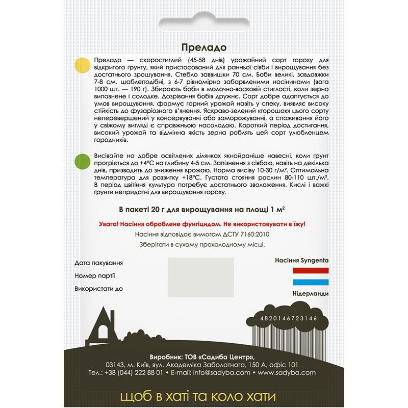 Надранній горох, темно-зелений, крупнозернистий, зморшкуватий. У стручку 7 насінин, довжина стебла 70 см. Можливість ранньої сівби, широка адаптація, вирівняне забарвлення.