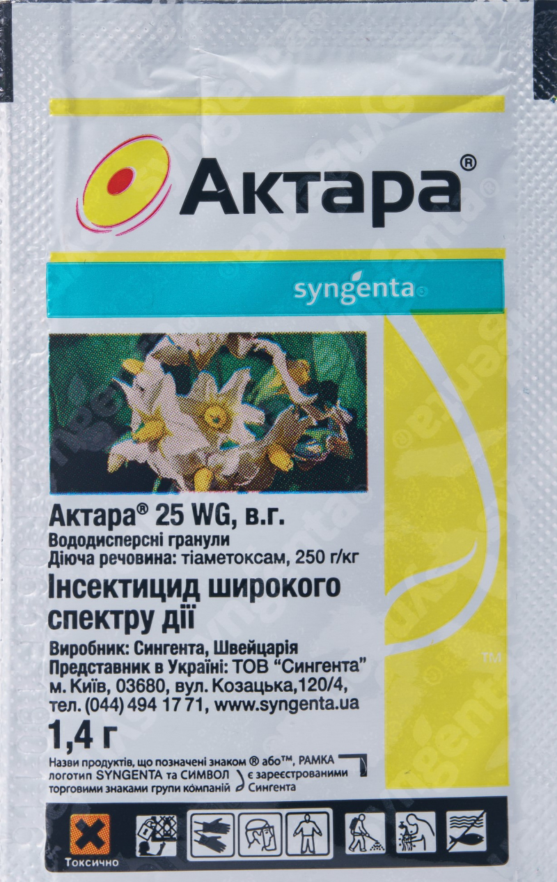 Актара - системний інсектицид нового покоління широкого спектру дії, який характеризуєтся високою ефективністю і прудуктивністю дії ( впродовж 15 хв. після обробки) незалежно від погодних умов і який направлений на захист посадок картоплі, томатів, баклажан, капусти і плодових дерев від багатьох шкідників. Унікальний новий механізм дії виключає розвиток перехресної стійкості до цього препарату.Діюча речовина Актари інтенсивно поглинається рослиною і швидко розноситься до найвіддаленіших точок росту, захищаючи всю рослину.Актара справляє на шкідників шлункову та контактну дію.