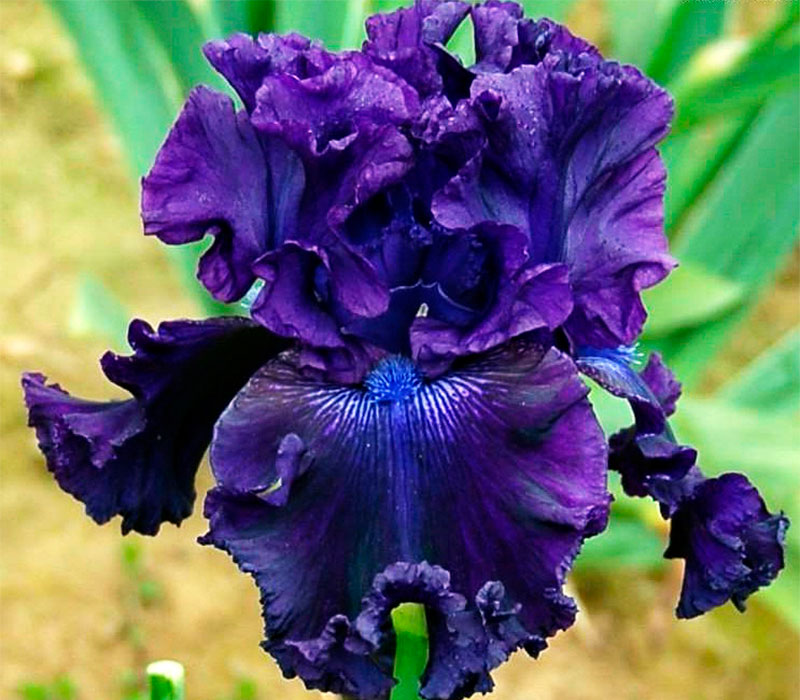 Ірис Hollywood Night - інтенсивного глибоко-фіолетового кольору. Фоли з більш темним блиском на гофрованих, злегка мереживних краях. Навколо синьо-фіолетової борідки - маленькі білі штрихи. Має виражений солодкий аромат.