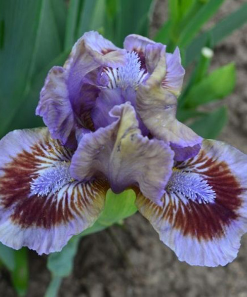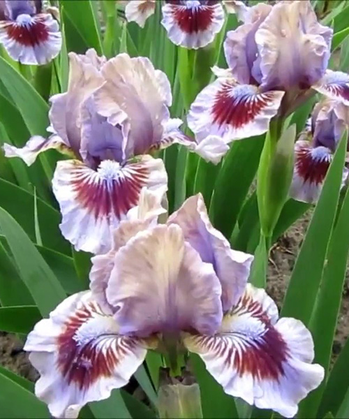Карликовий Ірис Posing (Позінг) – контрастно забарвлена ефектна квітка з гофрованими краями пелюсток. Верхні пелюстки – димчасто-бузкові (стандарти) з оливково-бежевими розводами. Нижні – ніжно лавандові з бордовою основою і тонкою оливковою каймою. Борідки – бузкові. Пуміла – це назва карликового виду ірисів, які підходять не тільки для міксбордерів, але і для альпійської гірки. Листя цього виду залишаються гарним весь сезон, не в'яне до пізньої осені.
