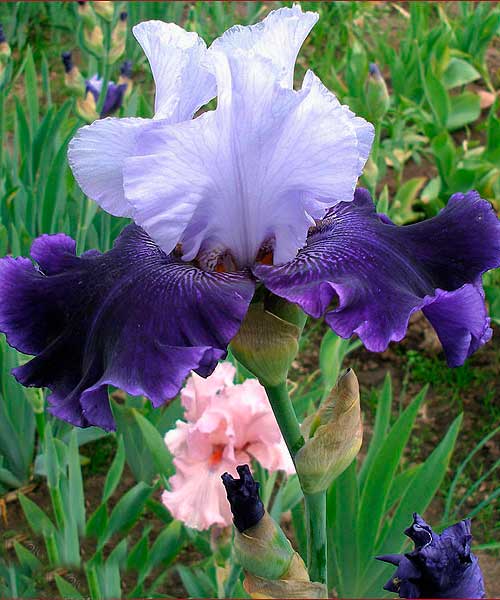 Ірис World Premier - красень з льодово-білими верхніми пелюстками, нижні пелюстки синьо-фіолетові, насичені, з тонкою бузкової облямівкою. Пелюстки щільні і хрусткі. Добре гофрована! Саме такий екземпляр обов'язково повинен бути в кожном саду. Цвітіння триває кілька тижнів. А тримається квітка ірису на стеблі від 1 до 5 днів. Терміни і тривалість цвітіння рослини залежать від температури. У спекотну, суху і сонячну весну, квітки розпускаються раніше, ніж зазвичай. Для посадки ірисів відведіть сонячне, сухе, захищене від вітру місце в саду. Грунт повинен бути досить легким і водопроникним. Важливо пам'ятати, що іриси бородаті не виносять перезволожених грунтів, і близького залягання грунтових вод. Від перезволоження кореневища загнивають. Якщо у вашому саду грунт важкий, поліпшити його можна додаванням піску і компосту. Якщо грунти перезволожені, висаджуйте іриси на піднятих клумбах або високих грядках.