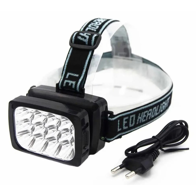 Ліхтар має 12 LED-ламп, які випромінюють розсіяне біле світло. Якщо потужність батарей мала, світлодіоди ще випромінюють слабке світло (аварійне освітлення). При ударах світлодіод практично не постраждає, тому вони дуже надійні. Ця модель оснащена зручним кріпленням – з двох стрічок (смуг). Одна з них охоплює голову, а друга йде від середини лоба до потилиці, надійно утримуючи ліхтар у потрібному положенні. Тільки такий спосіб кріплення не доставить вам клопоту в майбутньому: він не буде натирати, сповзати, збиватися набік. Джерело живлення налобного освітлювального приладу – вбудована акумуляторна батарея. Заряджати її можна стандартно – підключенням до розетки 220В, мережевий шнур для зарядки ліхтарика є в наборі. Заряджається акумулятор близько 12 годин. Час зарядки не повинно перевищувати 15 годин, заряджати ліхтар можна виключно у вимкненому стані, щоб уникнути поломки пристрою.