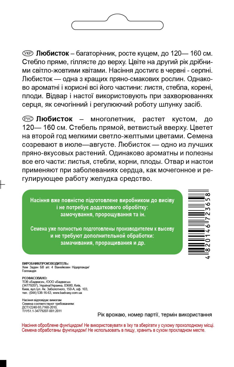 Багаторічник, росте кущем, до 120— 160 см. Стебло пряме, гіллясте до верху. Цвіте на другий рік дрібними світло-жовтими квітами. Насіння достигє в червні - серпні. Любисток — одна з кращих пряно-смакових рослин. Однаково ароматні і корисні всі його частини: листя, стебла, корені, плоди.. Відвар і настої використовують при захворюваннях серця, як сечогінний і регулюючий роботу шлунку засіб.