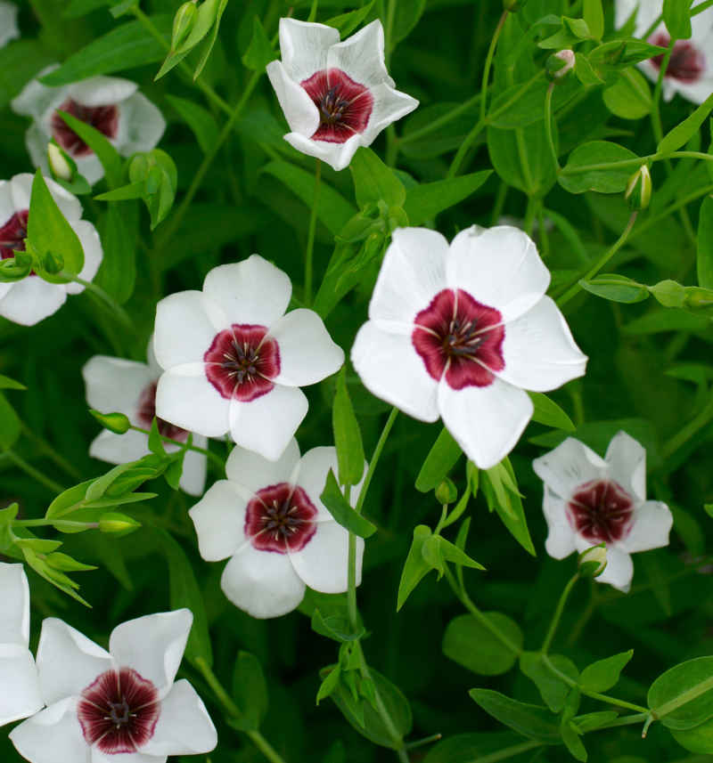 Льон великоквітковий, білий з червоним вічком – це однорічна трав'яниста рослина висотою до 45 см з витонченими прямостоячими гіллястими стеблами. Квітки дуже ніжні, зібрані на верхівці в пухке суцвіття-щиток, до 3 см в діаметрі. Насіння сіють ранньою весною, розкидаючи його по всій площі. Потім посіви боронують, при цьому закладаючи насіння в грунт на глибину до 1,5 - 2 см. Цвітіння рясне, з квітня по травень. Це невибаглива рослина, стійка до посухи, переносить незначні заморозки. Краще росте на сонячних ділянках з легкими грунтами. Використовується для оформлення клумб, міксбордерів і альпійських гірок; найбільш ефектно виглядає в групових посадках.