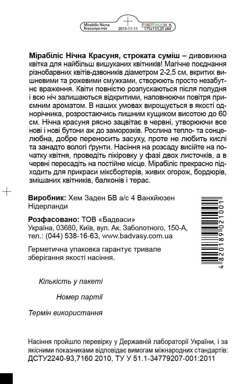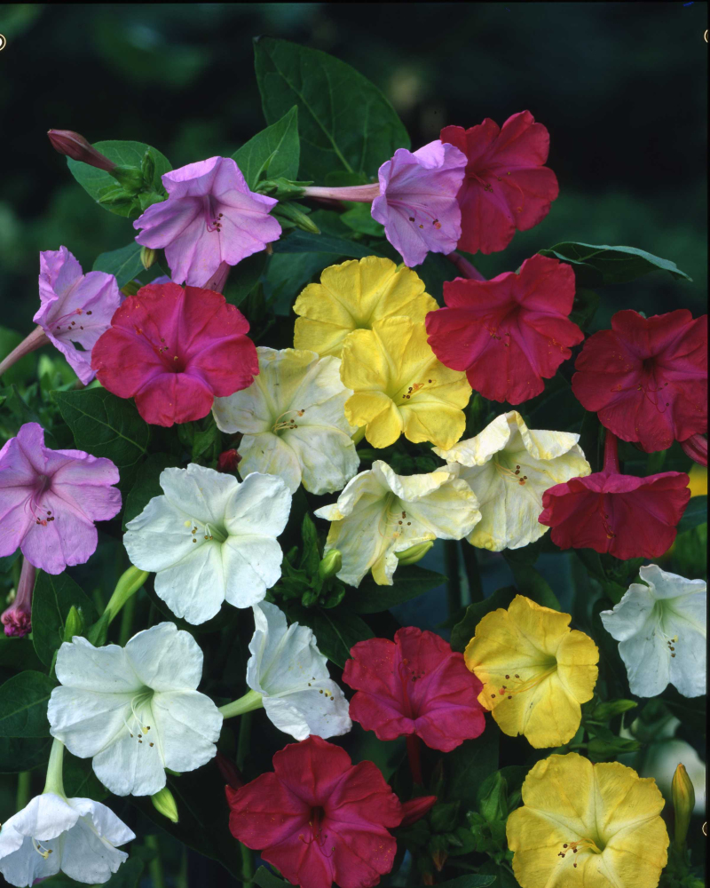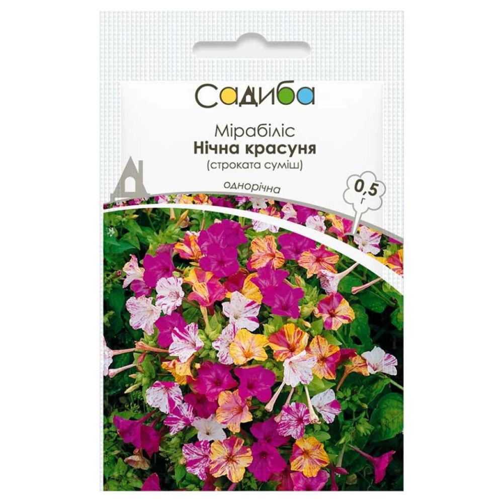 Мірабіліс Нічна Красуня, суміш – дивовижна квітка, здатна освіжити своїм виглядом навіть найбільш вишуканий квітник! Магічне поєднання різнобарвних квітів-дзвоників діаметром 2-2,5 см, вкритих вишневими чи рожевими смужками, створюють просто незабутнє враження. Квіти повністю розпускаються після полудня та всю ніч залишаються відкритими, наповнюючи повітря неземним ароматом. Це однорічна культура, яка розростається пишним кущиком висотою до 60 см. Рясно зацвітає в червні, випускаючи все нові і нові бутони аж до заморозків. Рослина тепло- та сонцелюбна, добре переносить засуху, проте не любить кислі та занадто вологі ґрунти. Насіння на розсаду висійте на початку квітня, проведіть пікіровку у фазі двох листочків, а в червні пересадіть на постійне місце. Прекрасно підходить для прикраси міксбордерів, живих огорож, бордюрів, змішаних квітників, балконів і терас.