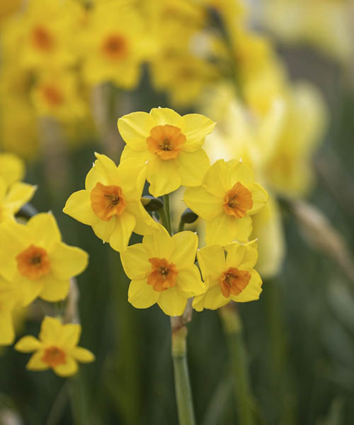 Висота рослини 25-35 см, що робить його ідеальним для переднього плану клумб або для вирощування в контейнерах. Починає цвісти у квітні, додаючи яскраві барви та аромат вашому саду. Кожна квітка складається з шести золотисто-жовтих пелюсток та крихітної помаранчевої корони. Квіти цього сорту невеликі, але численні — на кожному стеблі розвивається до восьми квіток, що забезпечує рясне цвітіння і привертає увагу. Аромоат інтенсивний, солодкуватий, що робить цей сорт особливо привабливим для вирощування як в саду, так і в приміщенні. Квіти добре тримаються в зрізі, що дозволяє створювати з них прекрасні букети та флористичні композиції.