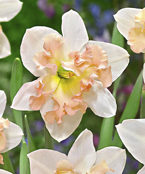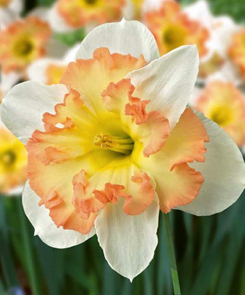 Нарцис Палмарес (Palmares) - це великокорончастий сорт, що вражає своїм елегантним зовнішнім виглядом, прикрашеним сильно гофрованою короною у приємних лососево-рожевих тонах. Квіти цього сорту мають біле забарвлення з відтінками лососевого та рожевого, що додає їм особливого шарму та вишуканості. Висота рослини досягає 35 см, а діаметр квітки становить 5-8 см. Palmares цвіте у квітні, даруючи радість весняного пробудження.
