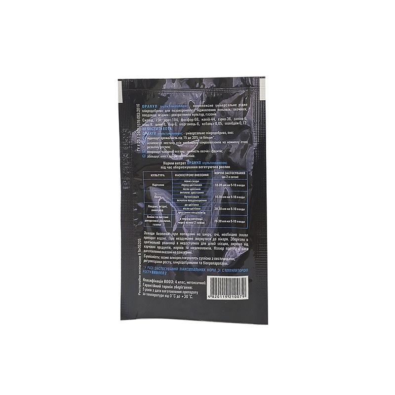 Оракул мультикомплекс – комплексне універсальне рідке мікродобриво для позакореневого підживлення польових, овочевих, плодових, ягідних, декоративних культур, лучних та газонних трав, яке містить пом’якшувач води.