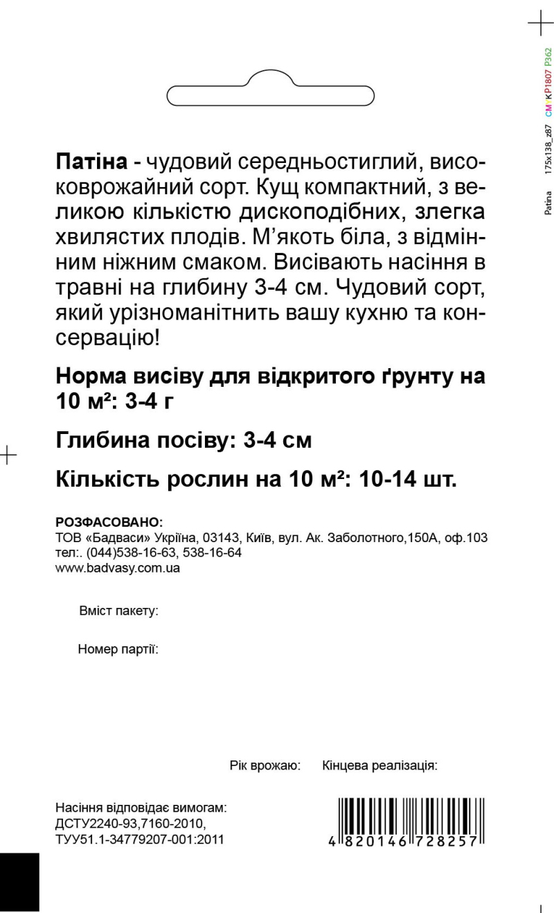 Патисон Патина - середньостиглий, високоврожайний сорт. Кущ компактний, з великою кількістю дископодібних, злегка хвилястих плодів. М'якоть біла, з відмінним ніжним смаком. Висівають насіння у відкритий грунт в травні на глибину 3-4 см. Відмінний сорт, який урізноманітнює вашу кухню і консервацію!