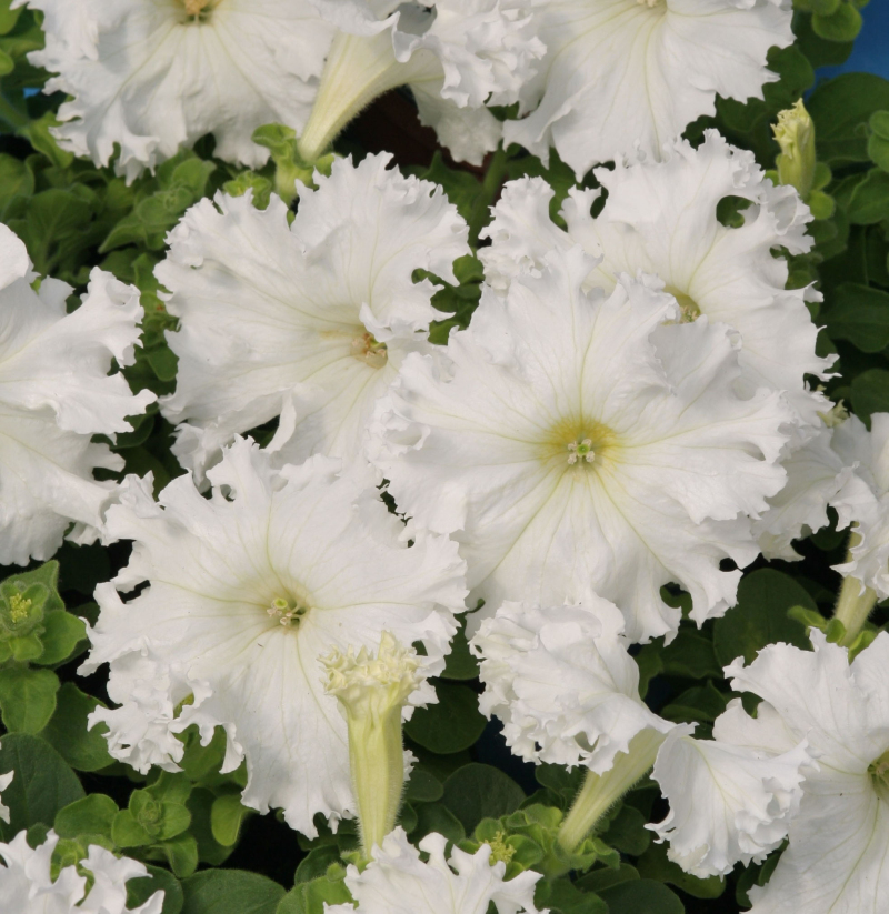 Петунія Афродіта F1, біла – нова великоквіткова петунія з хвилястими, бахромчатими квітами. Рослини гіллясті, стійкі, добре і пишно зростаючі, кущики досягають висоти 35 см. Квітки білосніжні, великі, діаметром 8-9 см. Посів проводять з лютого по березень. Сходи з'являються через 7-12 днів. На постійне місце висаджують, коли мине небезпека приморозків. Цвітуть рясно, з кінця травня весь сезон. Світлолюбна і досить посухостійка рослина. Її можна успішно вирощувати навіть за несприятливих кліматичних умов. Використовують для прикраси клумб, низькорослих бордюрів, вазонів, підвіконня. При посадці в балконні ящики рослини утворюють невеликий каскад.