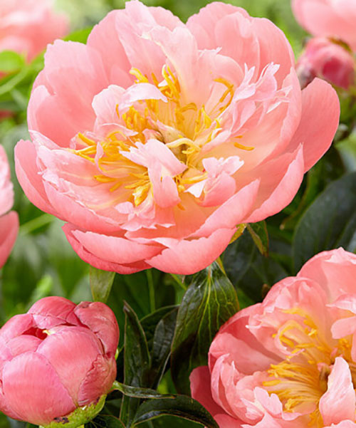 Півонія Pink Hawaiian Coral – морозостійка рослина, на кущах якої навесні розпускаються ніжні напівмахрові квіти. Сорт був зареєстрований 1981 року американським селекціонером Чарльзом Клемом. Це незвичайний гібрид для саду, який приваблює ароматними квітами з цікавим забарвленням пелюсток. Квітки цього сорту пишні, дивовижного коралово-рожевого відтінку. Пелюстки широкі, темніші зовні, світлі всередині і кремові біля основи. Вони оточують центр, наповнений численними яскраво-жовтими тичинками. Висота рослин – 80-100 см. Діаметр квіток – 16-18 см. Період цвітіння – травень-червень. Квітки приємно пахнуть. Глянцеве темно-зелене листя цього сорту довго залишається привабливим, тому клумби з півонії красиві протягом усього сезону.