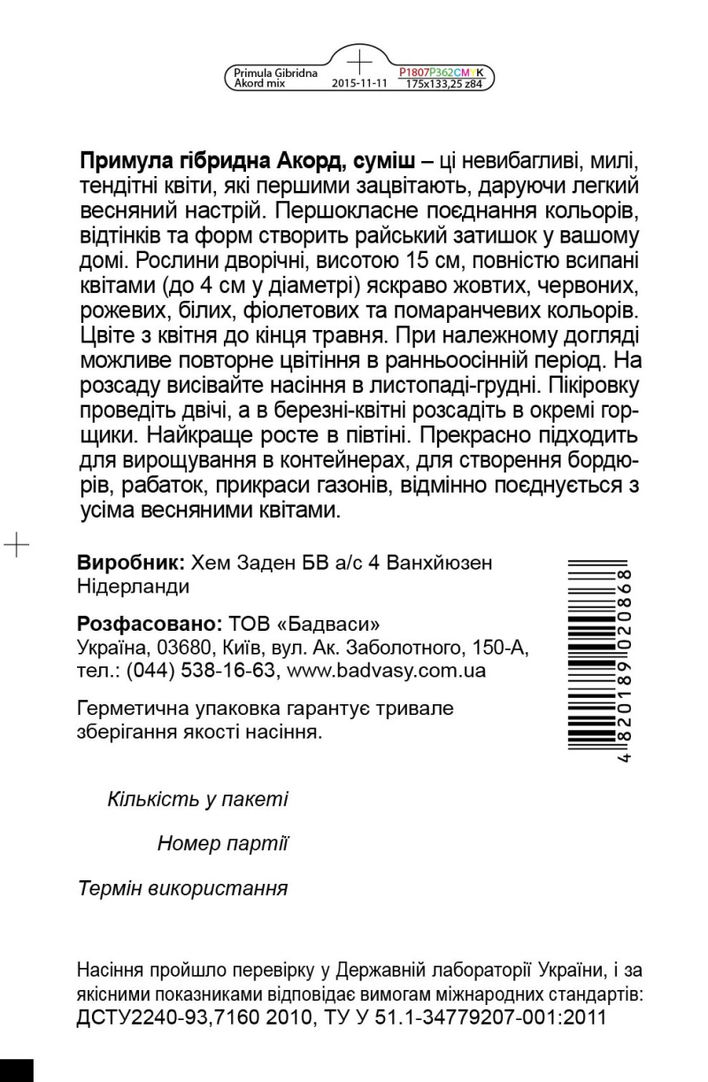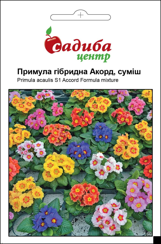 Примула гібридна Акорд S1, суміш – першокласне поєднання кольорів, відтінків та форм створить райський затишок у вашому домі і на квітнику. Ці маленькі невибагливі, милі та тендітні квіти одними з перших зацвітають та дарують легкий весняний настрій. Рослини дворічні, висотою лише 15 см, повністю усипані квітами (до 4 см у діаметрі) яскраво жовтих, червоних, рожевих, білих, фіолетових та помаранчевих кольорів. Цвіте з квітня до кінця травня. При належному догляді можливе повторне цвітіння в ранньоосінній період. На розсаду висівайте насіння в листопаді-грудні. Пікіровку проведіть двічі, а в березні-квітні розсадіть в окремі горщики. Після цвітіння рослину можна висадити в сад чи на клумбу. Найкраще росте в півтіні. Прекрасно підходить для вирощування в контейнерах, для створення бордюрів, рабаток, прикраси газонів, відмінно поєднується з усіма весняними квітами.