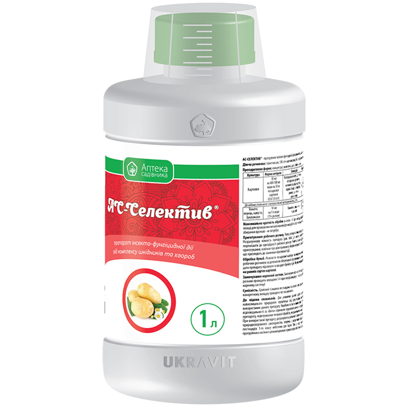 АС-Селектив - новітній інсекто-фунгіцид для протруювання бульб картоплі перед їх посадкою в грунт. Контролює комплекс хвороб і ґрунтових шкідників та запобігає їх поширенню на протязі вегетації культури.