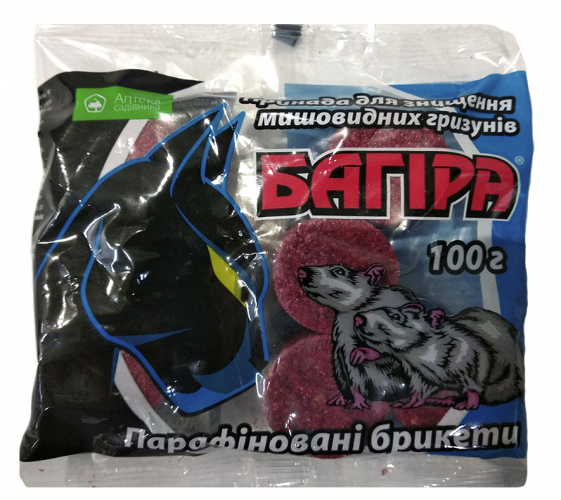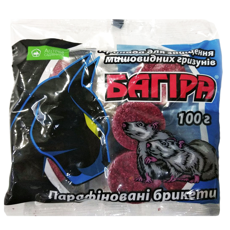Багіра парафінові брикети - родентицид у вигляді отруйних парафінових брикетів для знищення мишовидних гризунів у житлових, промислових приміщеннях, на присадибних ділянках, та сільськогосподарських угіддях.