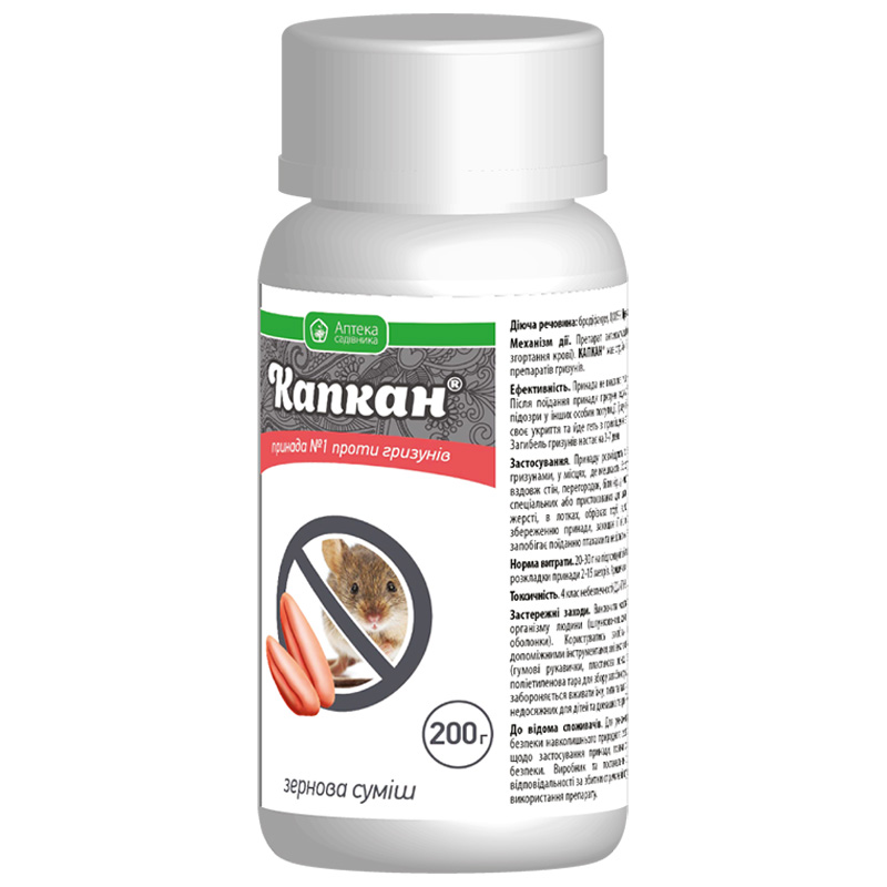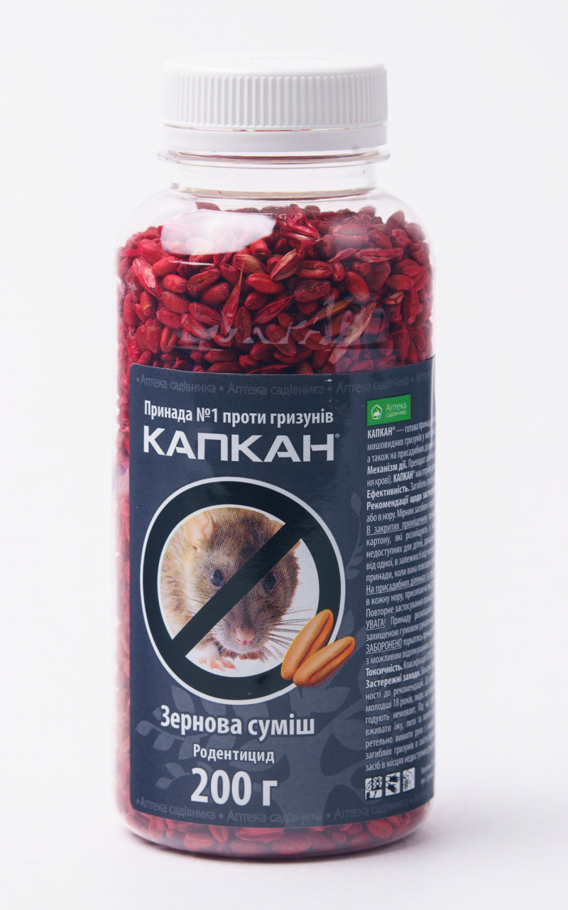 Капкан зернова принада - готова принада у вигляді отруйної суміші насіння культурних рослин для знищення мишовидних гризунів у житлових, промислових та нежилих приміщеннях, а також на сільскогосподарських угіддях та на присадибних ділянках.