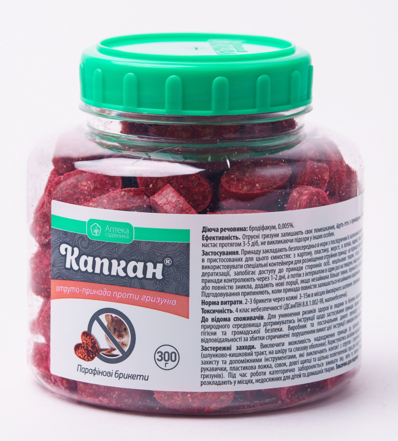 Капкан парафінові брикети - готова принада у вигляді отруйної суміші насіння культурних рослин для знищення мишовидних гризунів у житлових, промислових та нежилих приміщеннях, а також на сільскогосподарських угіддях та на присадибних ділянках.