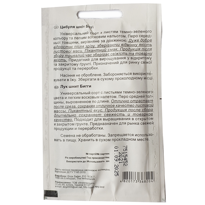 Лук-шнит Бигги - это многолетний холодостойкий сорт. Растет в длину 20-35 см. В молодом возрасте листья имеют приятный, полуострый вкус и аромат, в них много витамина С и кератина. Листья прямостоячие, темно-зеленого цвета, с цветком. Растение является хорошим медоносом. Отличается хорошей транспортабельностью, выращивается для свежего употребления.