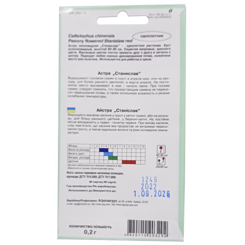 Астра Станислав – однолетнее растение с непревзойденными пионовидными цветами. Куст колоновидный, высотой 60-80 см. Соцветия махровые, красного цвета. Язычковые цветки плотно прижаты друг к другу и загнуты к центру. Высаживают цветы для декоративного оформления придомовой территории, цветника и срезов в букеты. Высаживается астра в рыхлую, хорошо плодородную почву с большим количеством питательных веществ. Посадку производят на солнечных или слегка затененных участках, имеющих защиту от сильных ветров. Оптимальным периодом для посадки является март – апрель. Выращивается астра путем посадки в открытый и закрытый грунт. При посадке рассадным способом семена высевают в начале весны. При появлении полноценных 3-5 листьев рассаду высаживают в открытый грунт.