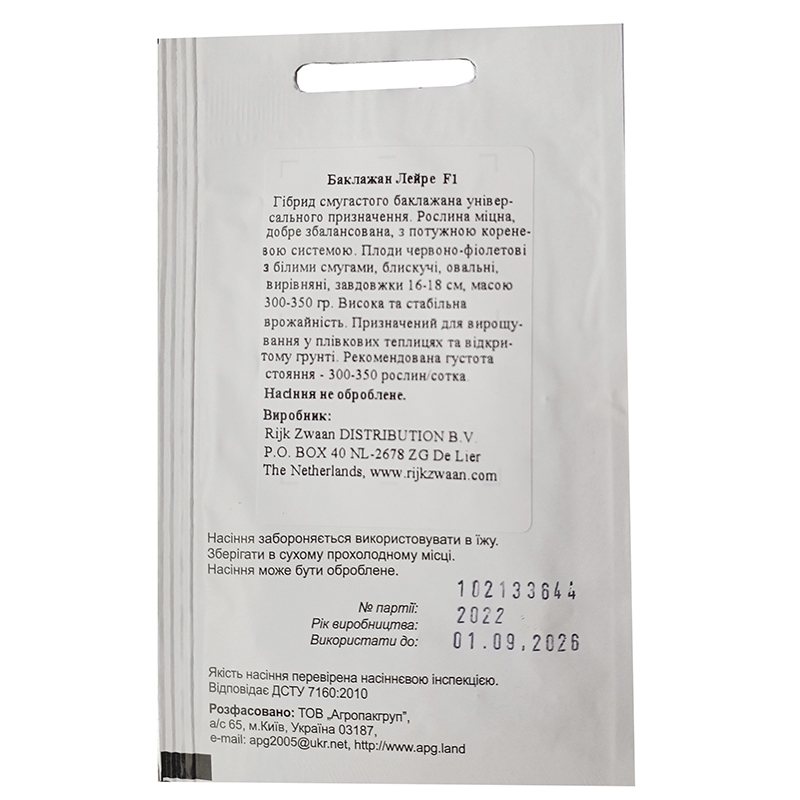 Баклажан Лейре F1 — ранний гибрид универсального назначения от всемирно известной компании Rijk Zvaan (Нидерланды). Срок вегетации 70–75 дней.