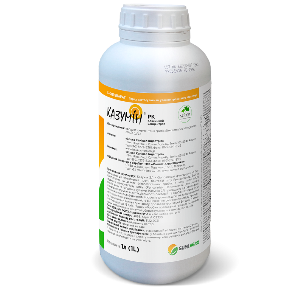Механизм действия: системный бактерицидный фунгицид лечебного действия, основной сферой применения которого является лечение бактериозов вызванных бактериями Erwinia, Pseudomonas, Xantomonas. Казумин влияет на пролиферацию (деление и размножение) клеток бактерий, останавливая синтез белка, влияет на РНК, в результате чего прекращается рост и размножение бактерий.