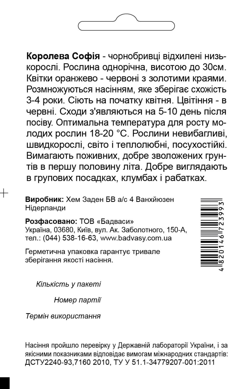 Бархатцы Королева София - бархатцы раскидистые низкорослые. Растение однолетнее, высотой до 30 см. Цветки оранжево - красные с золотыми краями. Размножаются семенами, которые сохраняют всхожесть 3-4 года. Сеют в начале апреля. Цветения - в июне. Всходы появляются на 5-10 день после посева. Оптимальная температура для роста молодых растений 18-20 ° С. Растения неприхотливы, быстрорастущие, светло и теплолюбивые, засухоустойчивые. Требуют питательных, хорошо увлажненных почв в первую половину лета. Хорошо смотрятся в групповых посадках, клумбах и рабатках.