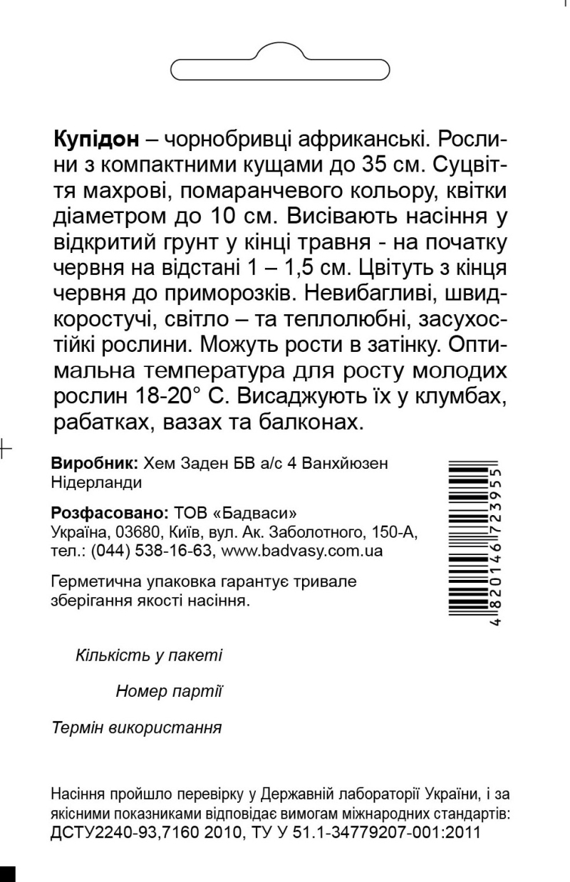 Бархатцы Купидон, оранжевые - бархатцы африканские. Однолетние растения, образуют компактные кусты до 35 см в высоту. Цветки оранжевые, соцветия махровые, диаметром до 10 см. Высевают семена в открытый грунт в конце мая - начале июня, на расстоянии 1 - 1,5 см. Цветут с конца июня до заморозков. Неприхотливые, быстрорастущие, светло - и теплолюбивые, засухоустойчивые растения. Оптимальная температура для роста молодых растений 18-20 ° С Могут расти в тени. Высаживают их в клумбах, рабатках, вазах и балконах.