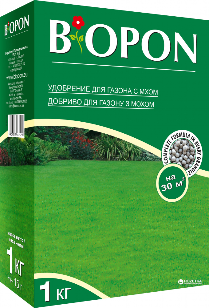 Удобрение гранулированное BIOPON для газонов со мхом - современное многокомпонентное удобрение предназначено для ухода за газонами со мхом. Тщательно разработанный состав обеспечивает траве правильный рост, густоту и сочную зелень. Повышенное содержание железа препятствует развитию мха, не позволяя ему разрастаться. Азот, содержащийся в удобрении ускоряет зарастание пустых мест травой.