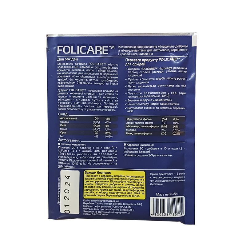 Удобрение для орхидей Folicare® - это водорастворимое минеральное удобрение, содержащее сбалансированный комплекс элементов питания как макро так и микро веществ, предназначенное для слоеного и корневого питания монопоидальным, симподиальным орхидеям: фаленопсис, котлея, цимбидиум, пафиопедилум (башмачок венеры) и многим другим видам орхидей.