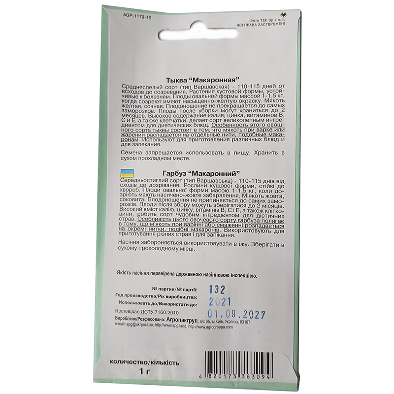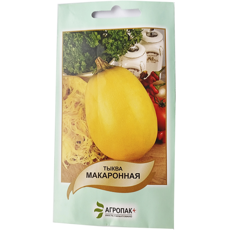 Тыква Макаронная – это среднеспелый сорт. Вегетационный период которого составляет 110-115 дней от всходов до созревания. Растение кустовой формы, устойчиво к болезням. Плоды овальной формы массой 1-1,5 кг, когда созреют имеют насыщенно-желтую окраску. Мякоть желтая, сочная. Плодоношение не прекращается до заморозков. Плоды после уборки могут храниться до 2 месяцев. Высокое содержание калия, цинка, витаминов B, C и E, а также клетчатки делает сорт отличным ингредиентом для диетических блюд. Особенность этого овощного сорта тыквы состоит в том, что мякоть при варке или жарке распадается на отдельные нити, подобные макаронам. Используют для приготовления различных блюд и запекания.