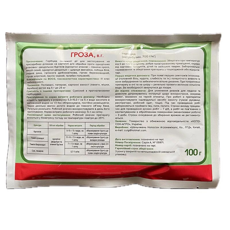 Гроза – системный грунтовой и страховой гербицид от однолетних двудольных и однодольных сорняков на посевах картофеля, томатов, сои и люцерны.