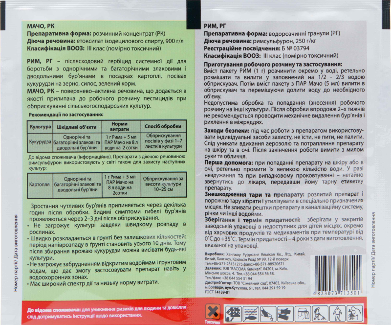 РИМ, РГ - послевсходовый гербицид системного действия для борьбы с однолетними и многолетними злаковыми и двудольными сорняками в посадках картофеля, посевах кукурузы на зерно, силос, зеленый корм + Мачо РК - - поверхностно-активное вещество, добавляемое в качестве прилипателя к рабочему раствору пестицидов при опрыскивании сельскохозяйственных культур.