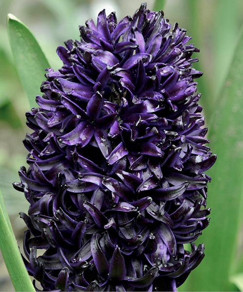 Гиацинт Дарк Дименшн (Dark Dimension) – этот сорт практически чёрного цвета. Он тёмно-фиолетовый. Наиболее тёмный сорт, который вы когда-нибудь видели. Его цветонос 20-25 см высотой. Цветки колокольчатые, многочисленные (до 35 штук), завернутые, в плотном соцветии. Размер цветка – около 4 см в диаметре и столько же или чуть больше длиной. Данный сорт отличается не только красотой, но и самым отличным ароматом. Цветы обладают сильным и стойким сладким ароматом. Соцветия – кисть, шаровидно-цилиндрической формы и высотой от 20 до 30 см. Цветки распускаются в середине весны. Цветёт данный сорт продолжительно, до трёх недель. Листья линейные, гладкие, желобчатые, сине-зелёные, собраны в прикорневые розетки по 9 штук. Их размер – от 10 до 30 см длиной. Этот гиацинт предназначен для выращивания на открытом воздухе, но не готов к раннему цветению в помещении.