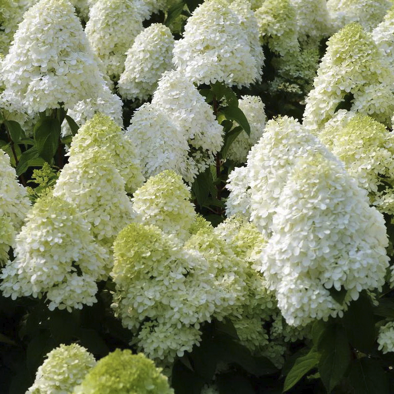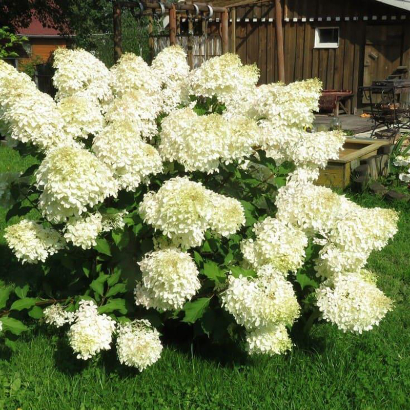 Кусты вырастают почти до двух метров высотой, достигая в объеме более полутора метров. Сильные жесткие ветви не склонны к обламыванию. Продолговатые листья имеют насыщенную зеленую окраску, осенью они желтеют. Цветы очень крупные – свыше 3 см в диаметре. Вначале они имеют фисташковый оттенок, в разгар цветения – нежно-белые, а при отцветании становятся розоватыми. Цветут эти гортензии долго: с середины лета и до самых холодов.